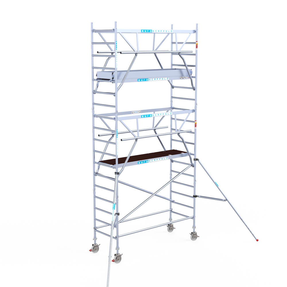 Let wel; Door de vernieuwde EN 1004 norm en het A-blad rolsteigers voldoen de Euroscaffold Euro met enkel schoren zonder voorloopleuning niet meer aan de regelgeving voor zakelijk gebruik. De Euro uitvoering met voorloopleuningen voldoen hier wel aan. Voor particulier gebruik is de uitvoering met schoren wel voldoende.