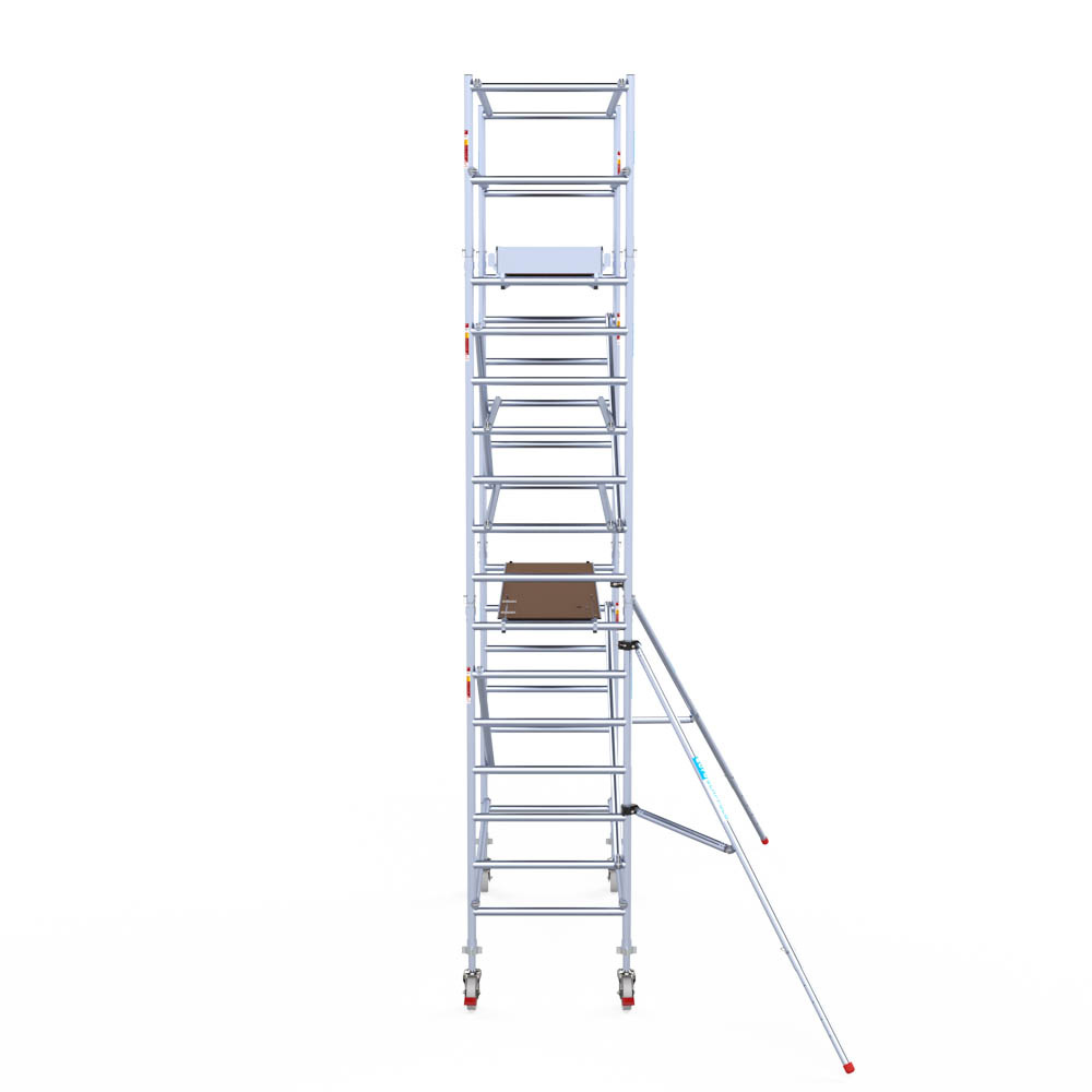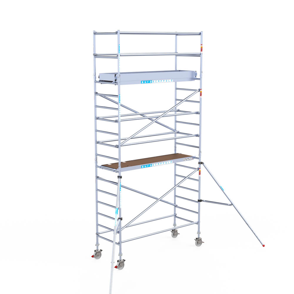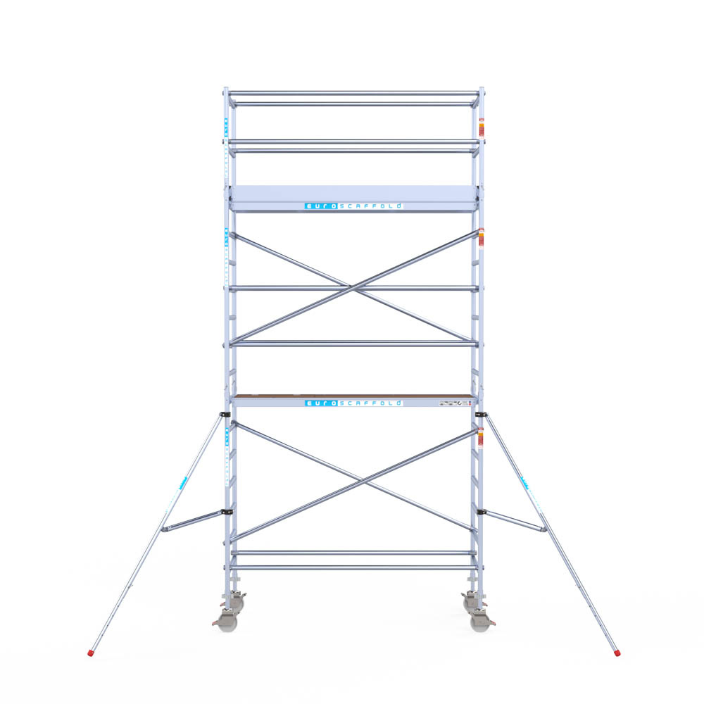 Let wel; Door de vernieuwde EN 1004 norm en het A-blad rolsteigers voldoen de Euroscaffold Euro met enkel schoren zonder voorloopleuning niet meer aan de regelgeving voor zakelijk gebruik. De Euro uitvoering met voorloopleuningen voldoen hier wel aan. Voor particulier gebruik is de uitvoering met schoren wel voldoende.