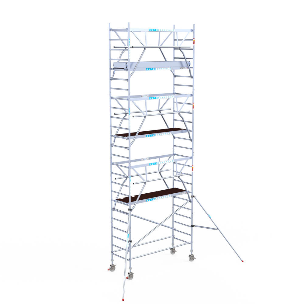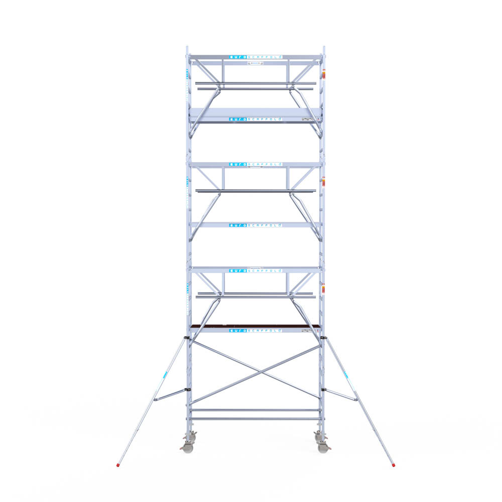 Let wel; Door de vernieuwde EN 1004 norm en het A-blad rolsteigers voldoen de Euroscaffold Euro met enkel schoren zonder voorloopleuning niet meer aan de regelgeving voor zakelijk gebruik. De Euro uitvoering met voorloopleuningen voldoen hier wel aan. Voor particulier gebruik is de uitvoering met schoren wel voldoende.