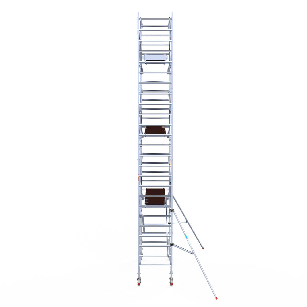 Deze rolsteiger heeft een steigerbreedte van 90, wat voor stabiliteit en stevigheid zorgt. De platformlengte is 250, wat voldoende werkruimte biedt. De werkhoogte van de rolsteiger is 8,2, waardoor je veilig op de gewenste hoogte kunt werken.