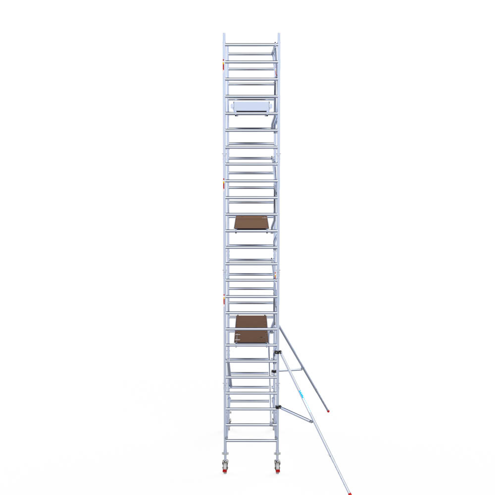 Deze rolsteiger heeft een steigerbreedte van 90, wat voor stabiliteit en stevigheid zorgt. De platformlengte is 250, wat voldoende werkruimte biedt. De werkhoogte van de rolsteiger is 8,2, waardoor je veilig op de gewenste hoogte kunt werken.