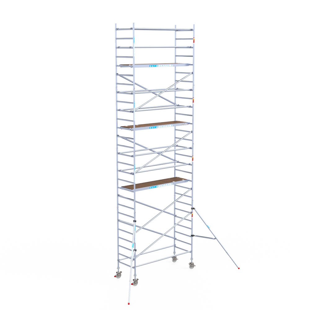 Let wel; Door de vernieuwde EN 1004 norm en het A-blad rolsteigers voldoen de Euroscaffold Euro met enkel schoren zonder voorloopleuning niet meer aan de regelgeving voor zakelijk gebruik. De Euro uitvoering met voorloopleuningen voldoen hier wel aan. Voor particulier gebruik is de uitvoering met schoren wel voldoende.