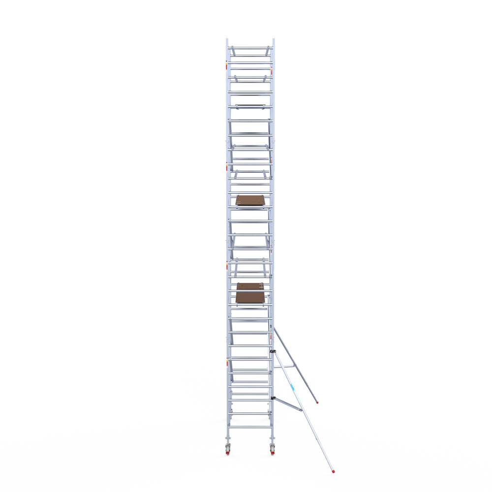 Deze rolsteiger heeft een steigerbreedte van 90, wat voor stabiliteit en stevigheid zorgt. De platformlengte is 250, wat voldoende werkruimte biedt. De werkhoogte van de rolsteiger is 9,2, waardoor je veilig op de gewenste hoogte kunt werken.
