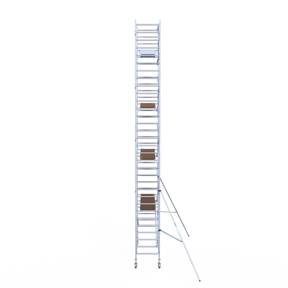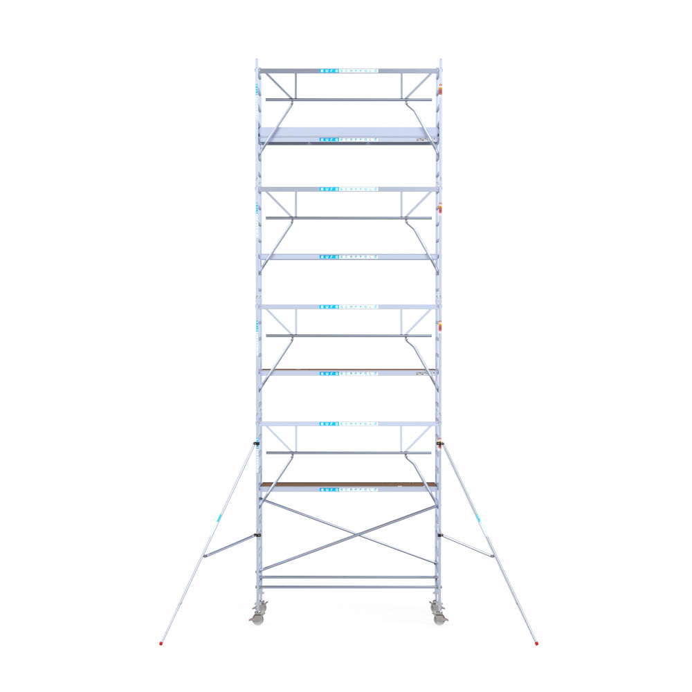 Let wel; Door de vernieuwde EN 1004 norm en het A-blad rolsteigers voldoen de Euroscaffold Euro met enkel schoren zonder voorloopleuning niet meer aan de regelgeving voor zakelijk gebruik. De Euro uitvoering met voorloopleuningen voldoen hier wel aan. Voor particulier gebruik is de uitvoering met schoren wel voldoende.