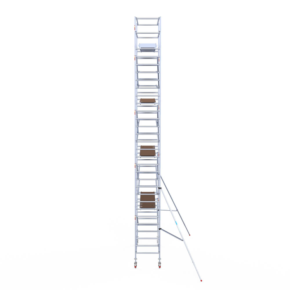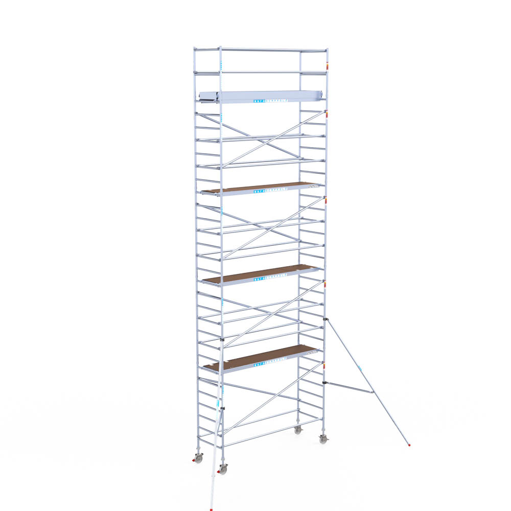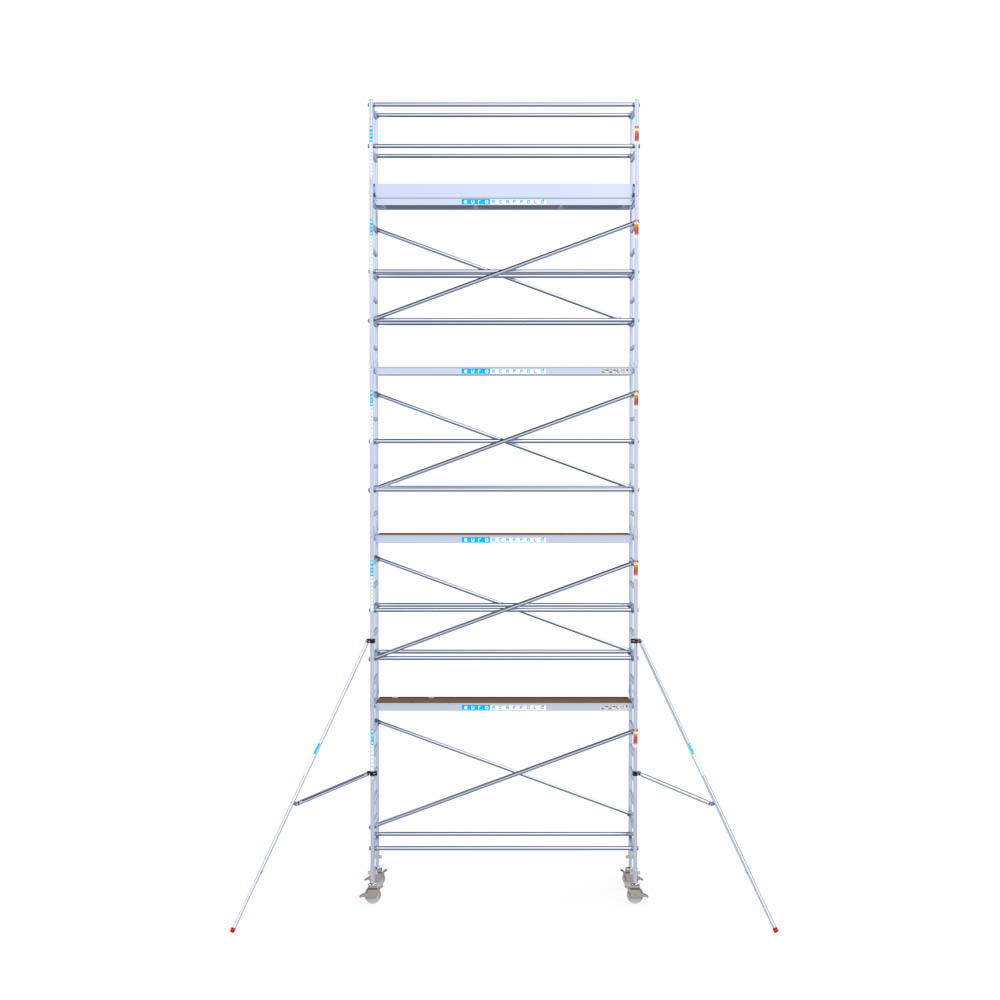 Let wel; Door de vernieuwde EN 1004 norm en het A-blad rolsteigers voldoen de Euroscaffold Euro met enkel schoren zonder voorloopleuning niet meer aan de regelgeving voor zakelijk gebruik. De Euro uitvoering met voorloopleuningen voldoen hier wel aan. Voor particulier gebruik is de uitvoering met schoren wel voldoende.