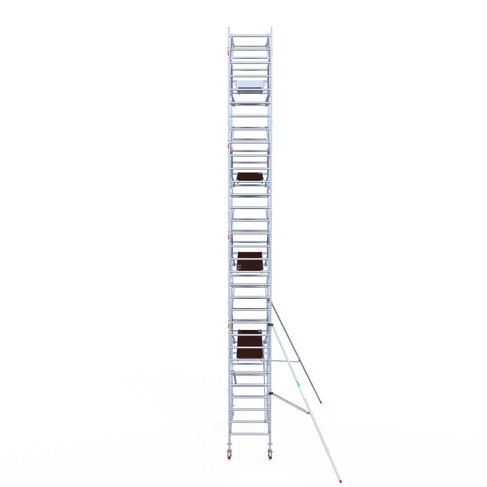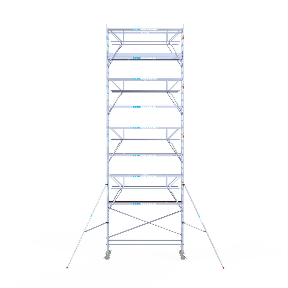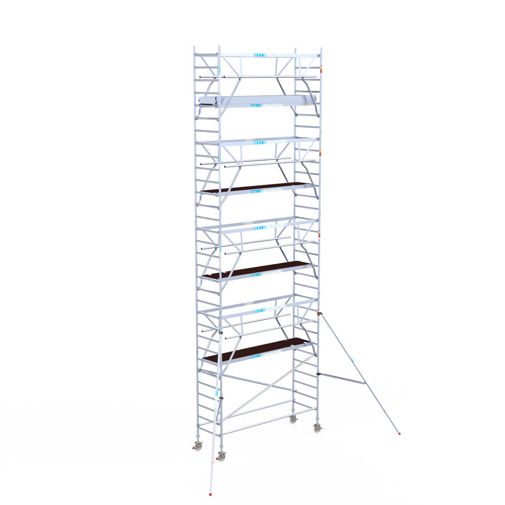 Let wel; Door de vernieuwde EN 1004 norm en het A-blad rolsteigers voldoen de Euroscaffold Euro met enkel schoren zonder voorloopleuning niet meer aan de regelgeving voor zakelijk gebruik. De Euro uitvoering met voorloopleuningen voldoen hier wel aan. Voor particulier gebruik is de uitvoering met schoren wel voldoende.