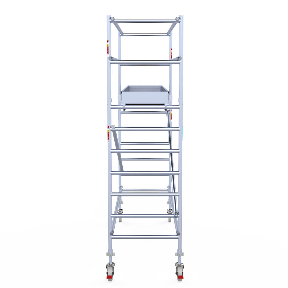 Let wel; Door de vernieuwde EN 1004 norm en het A-blad rolsteigers voldoen de Euroscaffold Euro met enkel schoren zonder voorloopleuning niet meer aan de regelgeving voor zakelijk gebruik. De Euro uitvoering met voorloopleuningen voldoen hier wel aan. Voor particulier gebruik is de uitvoering met schoren wel voldoende.