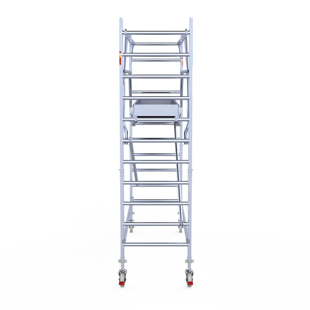 Deze rolsteiger heeft een steigerbreedte van 90, wat voor stabiliteit en stevigheid zorgt. De platformlengte is 305, wat voldoende werkruimte biedt. De werkhoogte van de rolsteiger is 4,2, waardoor je veilig op de gewenste hoogte kunt werken.