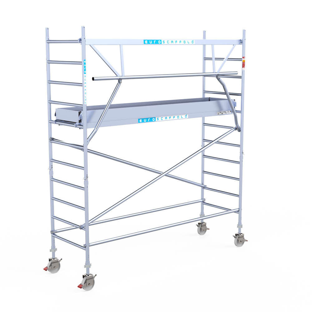 Let wel; Door de vernieuwde EN 1004 norm en het A-blad rolsteigers voldoen de Euroscaffold Euro met enkel schoren zonder voorloopleuning niet meer aan de regelgeving voor zakelijk gebruik. De Euro uitvoering met voorloopleuningen voldoen hier wel aan. Voor particulier gebruik is de uitvoering met schoren wel voldoende.