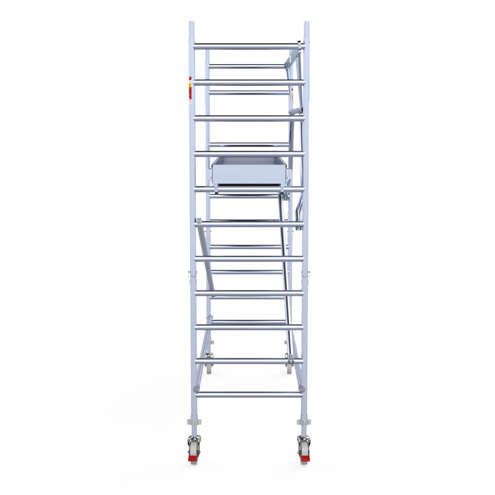 Deze rolsteiger heeft een steigerbreedte van 90, wat voor stabiliteit en stevigheid zorgt. De platformlengte is 305, wat voldoende werkruimte biedt. De werkhoogte van de rolsteiger is 4,2, waardoor je veilig op de gewenste hoogte kunt werken.