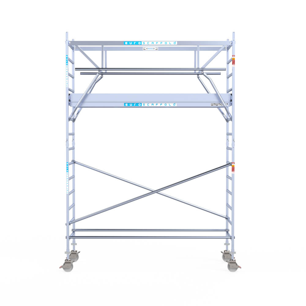 Let wel; Door de vernieuwde EN 1004 norm en het A-blad rolsteigers voldoen de Euroscaffold Euro met enkel schoren zonder voorloopleuning niet meer aan de regelgeving voor zakelijk gebruik. De Euro uitvoering met voorloopleuningen voldoen hier wel aan. Voor particulier gebruik is de uitvoering met schoren wel voldoende.