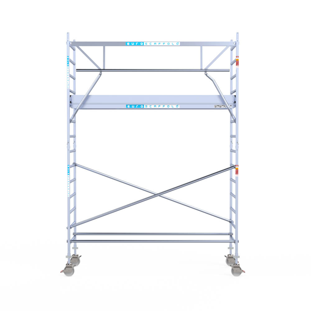 Let wel; Door de vernieuwde EN 1004 norm en het A-blad rolsteigers voldoen de Euroscaffold Euro met enkel schoren zonder voorloopleuning niet meer aan de regelgeving voor zakelijk gebruik. De Euro uitvoering met voorloopleuningen voldoen hier wel aan. Voor particulier gebruik is de uitvoering met schoren wel voldoende.