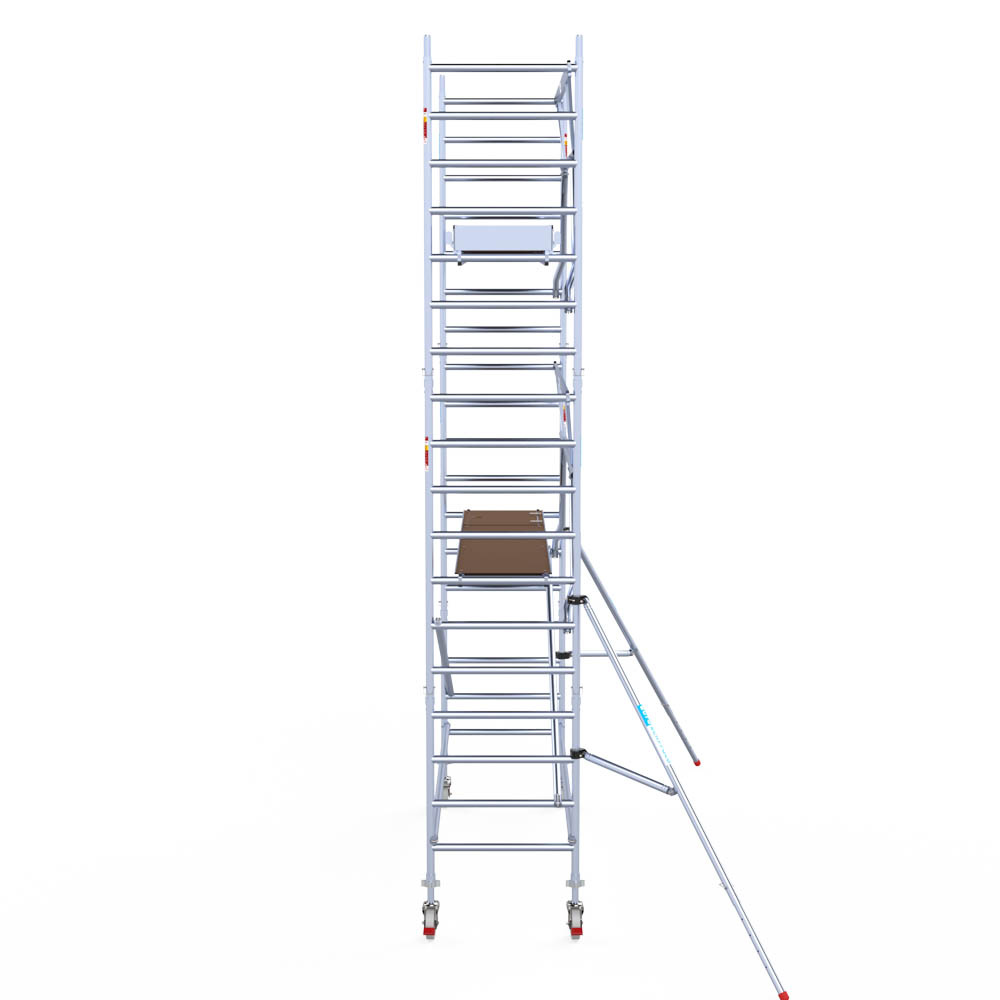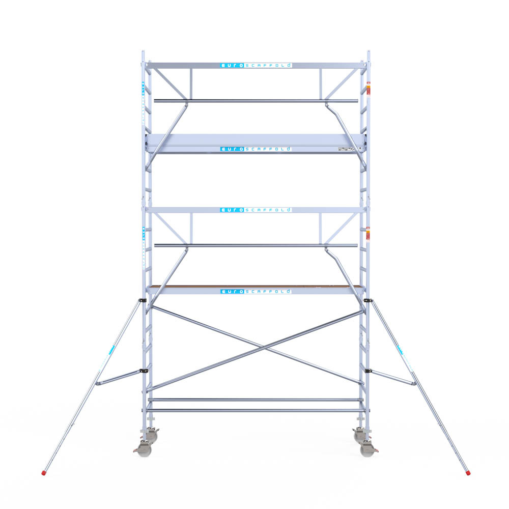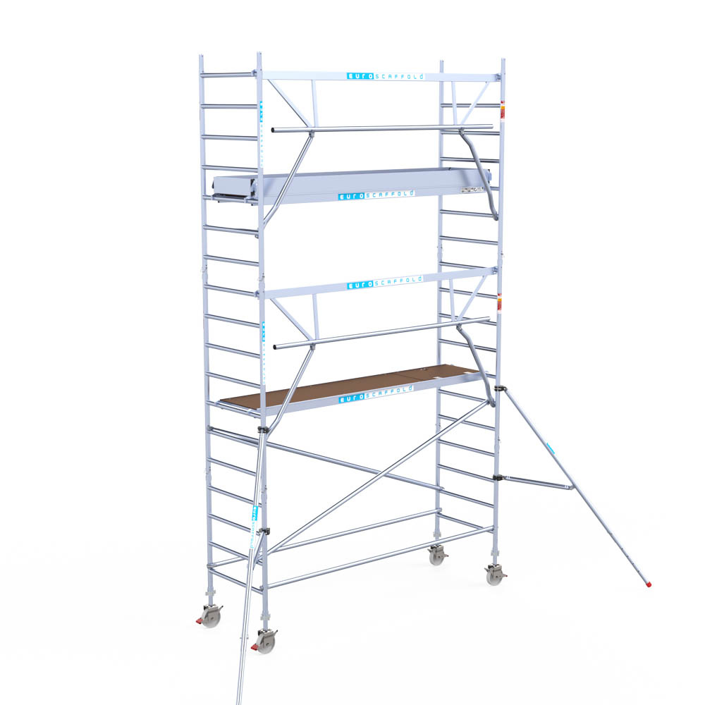 Let wel; Door de vernieuwde EN 1004 norm en het A-blad rolsteigers voldoen de Euroscaffold Euro met enkel schoren zonder voorloopleuning niet meer aan de regelgeving voor zakelijk gebruik. De Euro uitvoering met voorloopleuningen voldoen hier wel aan. Voor particulier gebruik is de uitvoering met schoren wel voldoende.