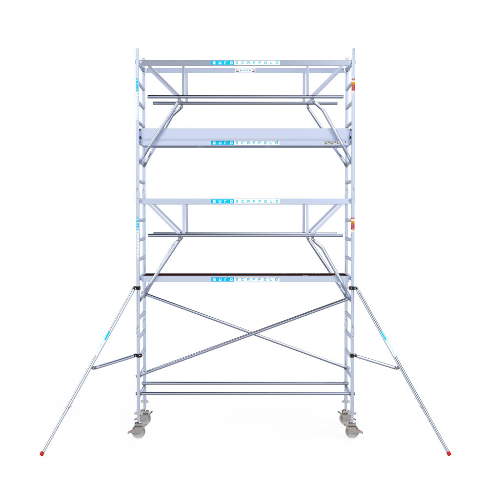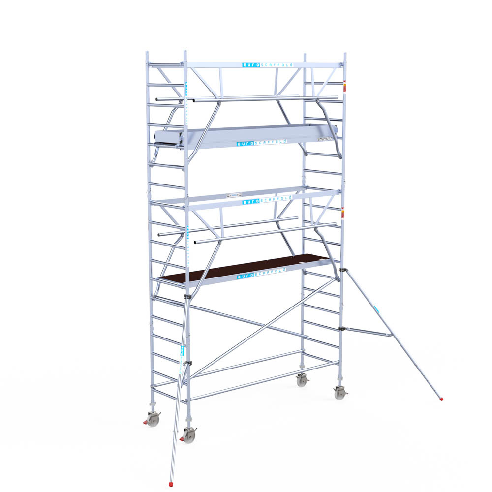Let wel; Door de vernieuwde EN 1004 norm en het A-blad rolsteigers voldoen de Euroscaffold Euro met enkel schoren zonder voorloopleuning niet meer aan de regelgeving voor zakelijk gebruik. De Euro uitvoering met voorloopleuningen voldoen hier wel aan. Voor particulier gebruik is de uitvoering met schoren wel voldoende.