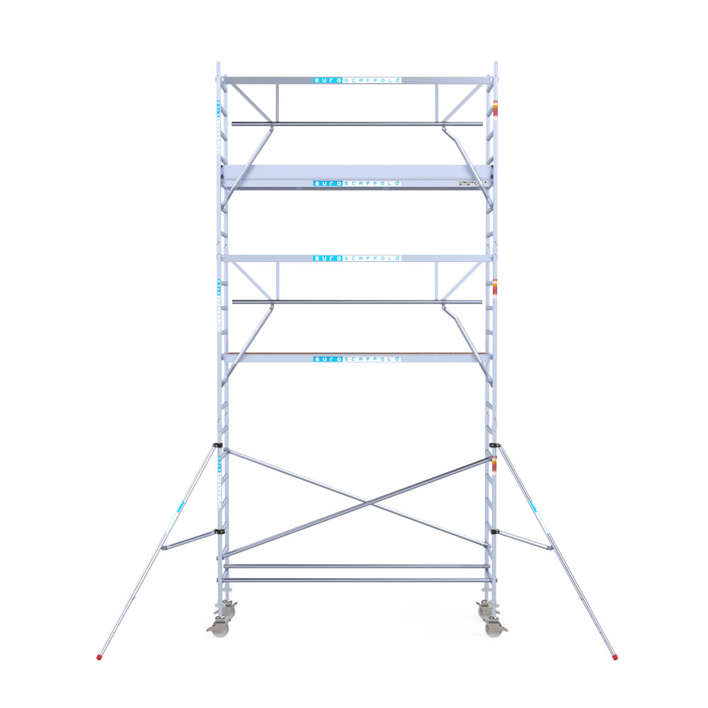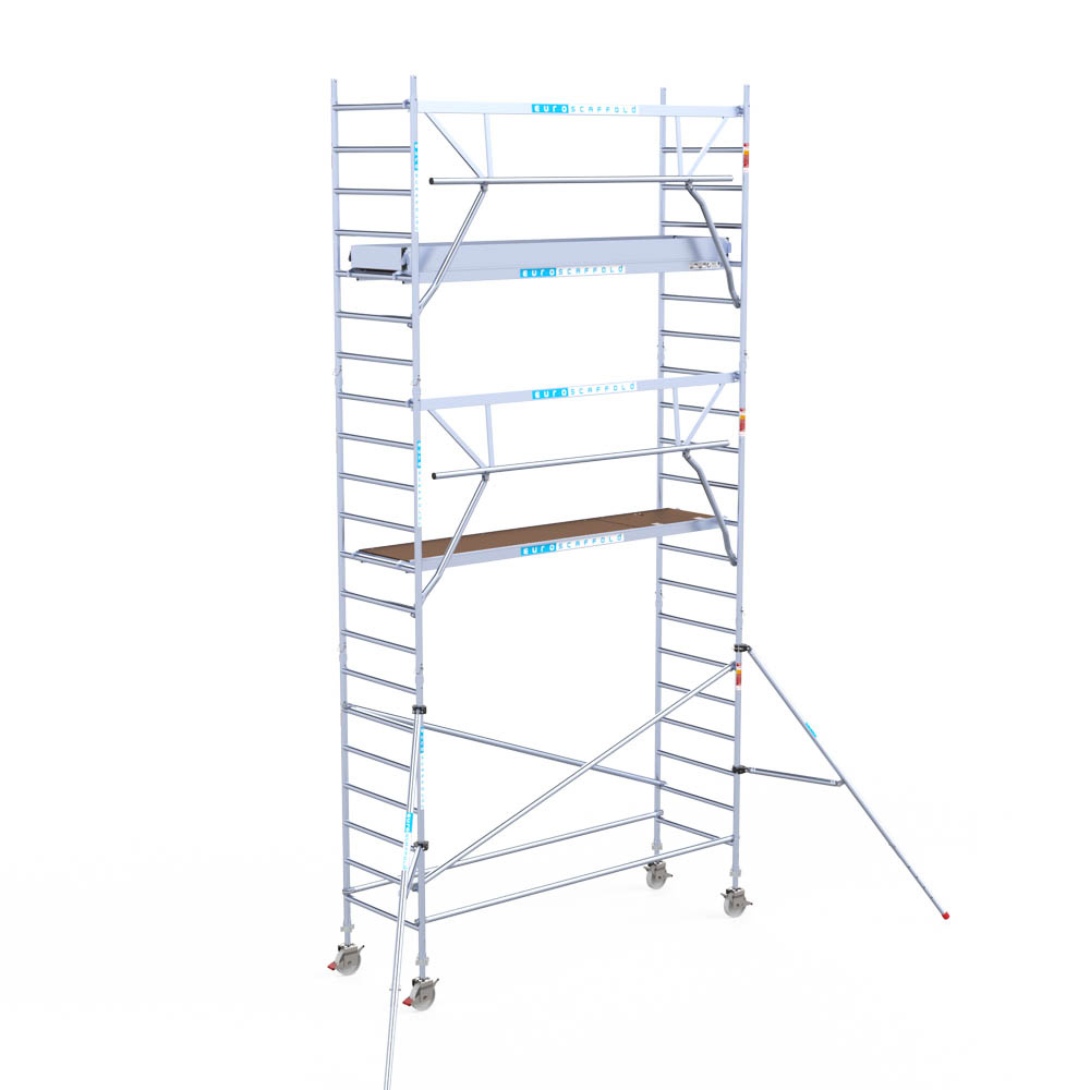 Let wel; Door de vernieuwde EN 1004 norm en het A-blad rolsteigers voldoen de Euroscaffold Euro met enkel schoren zonder voorloopleuning niet meer aan de regelgeving voor zakelijk gebruik. De Euro uitvoering met voorloopleuningen voldoen hier wel aan. Voor particulier gebruik is de uitvoering met schoren wel voldoende.