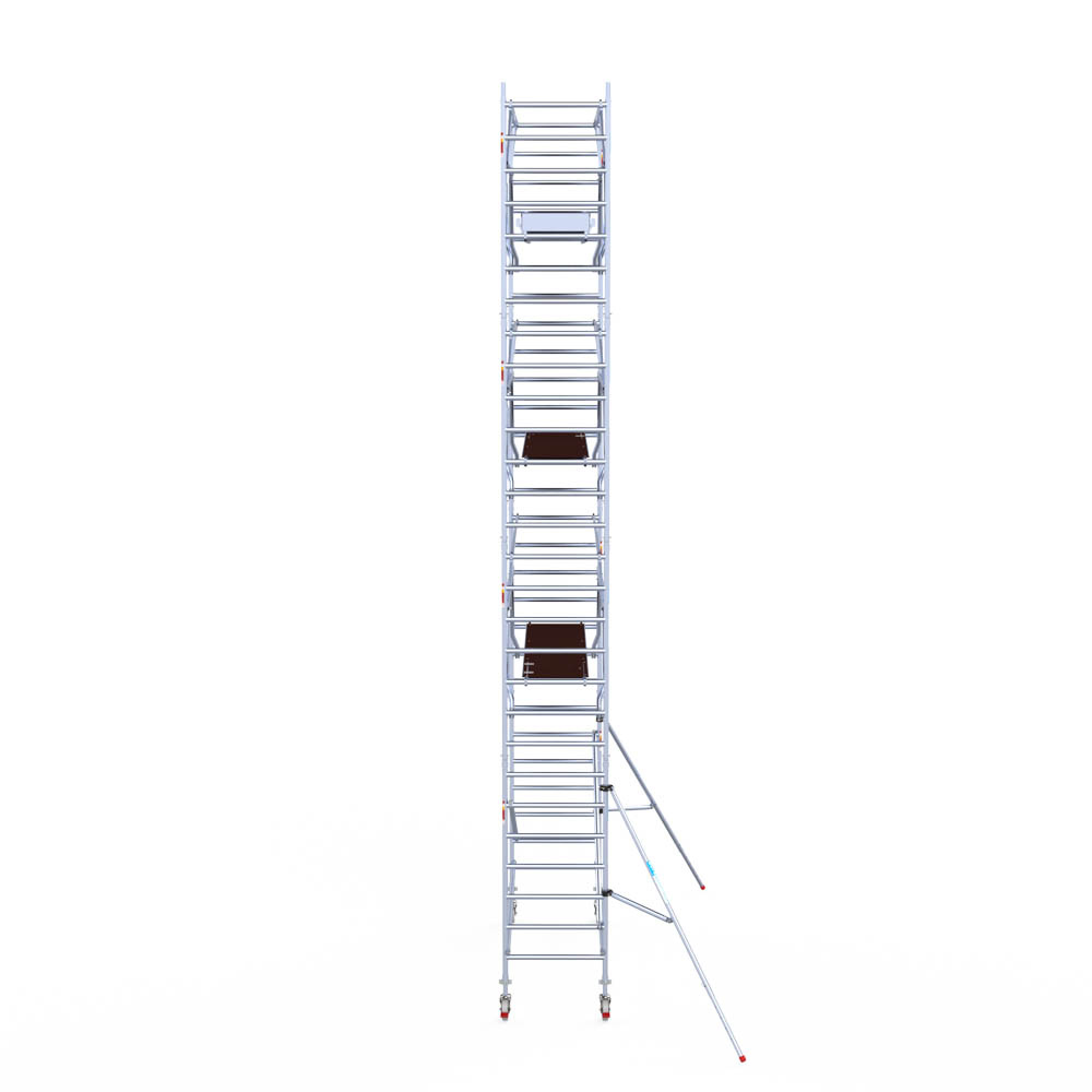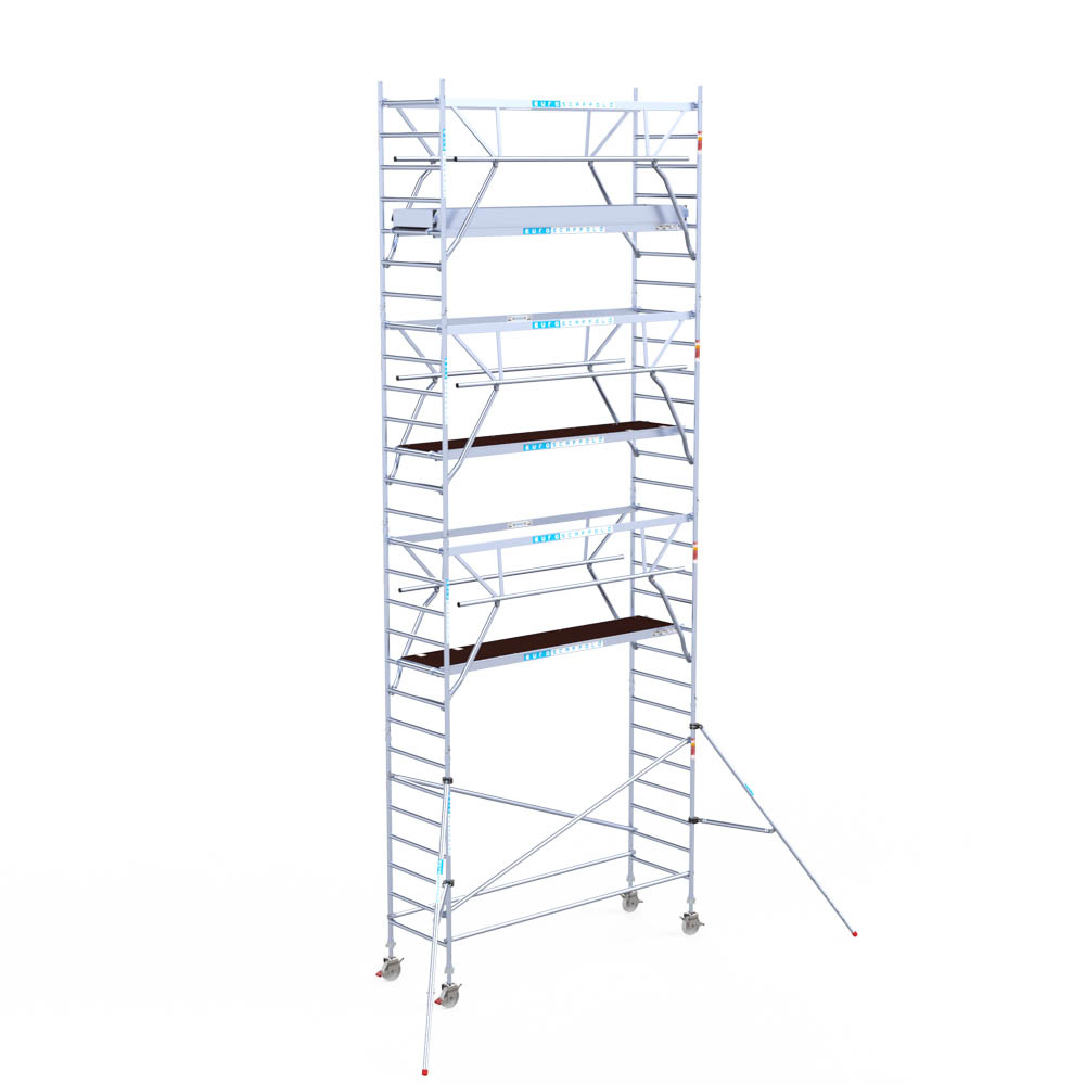 Deze rolsteiger heeft een steigerbreedte van 90, wat voor stabiliteit en stevigheid zorgt. De platformlengte is 305, wat voldoende werkruimte biedt. De werkhoogte van de rolsteiger is 9,2, waardoor je veilig op de gewenste hoogte kunt werken.