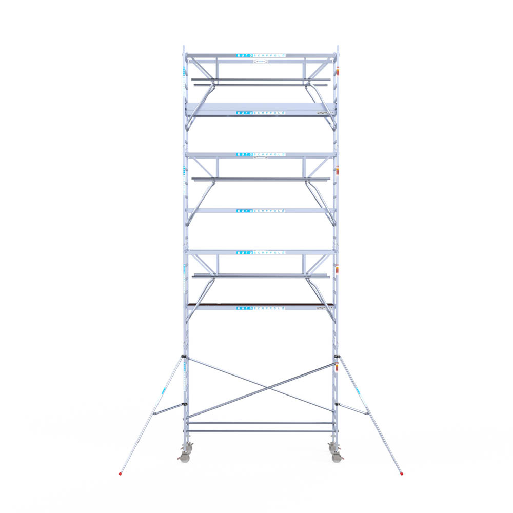 Let wel; Door de vernieuwde EN 1004 norm en het A-blad rolsteigers voldoen de Euroscaffold Euro met enkel schoren zonder voorloopleuning niet meer aan de regelgeving voor zakelijk gebruik. De Euro uitvoering met voorloopleuningen voldoen hier wel aan. Voor particulier gebruik is de uitvoering met schoren wel voldoende.