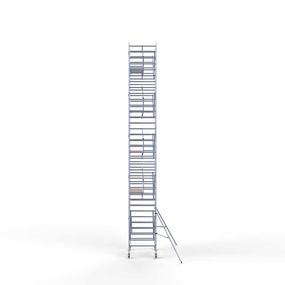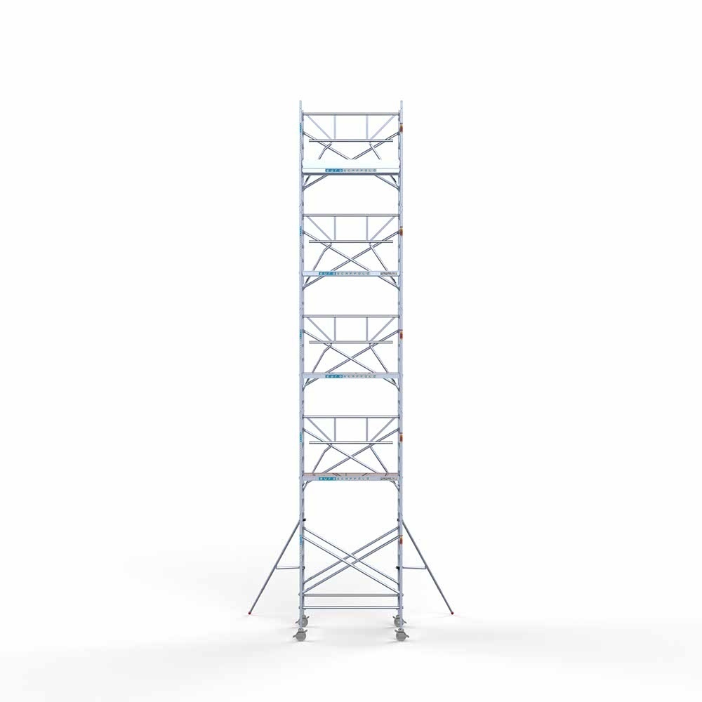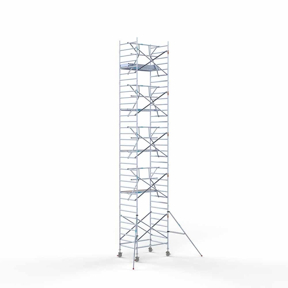 Deze rolsteiger heeft een steigerbreedte van 135, wat voor stabiliteit en stevigheid zorgt. De platformlengte is 190, wat voldoende werkruimte biedt. De werkhoogte van de rolsteiger is 11,2, waardoor je veilig op de gewenste hoogte kunt werken.