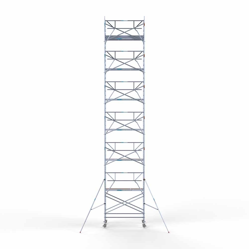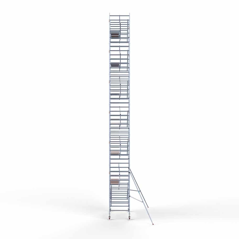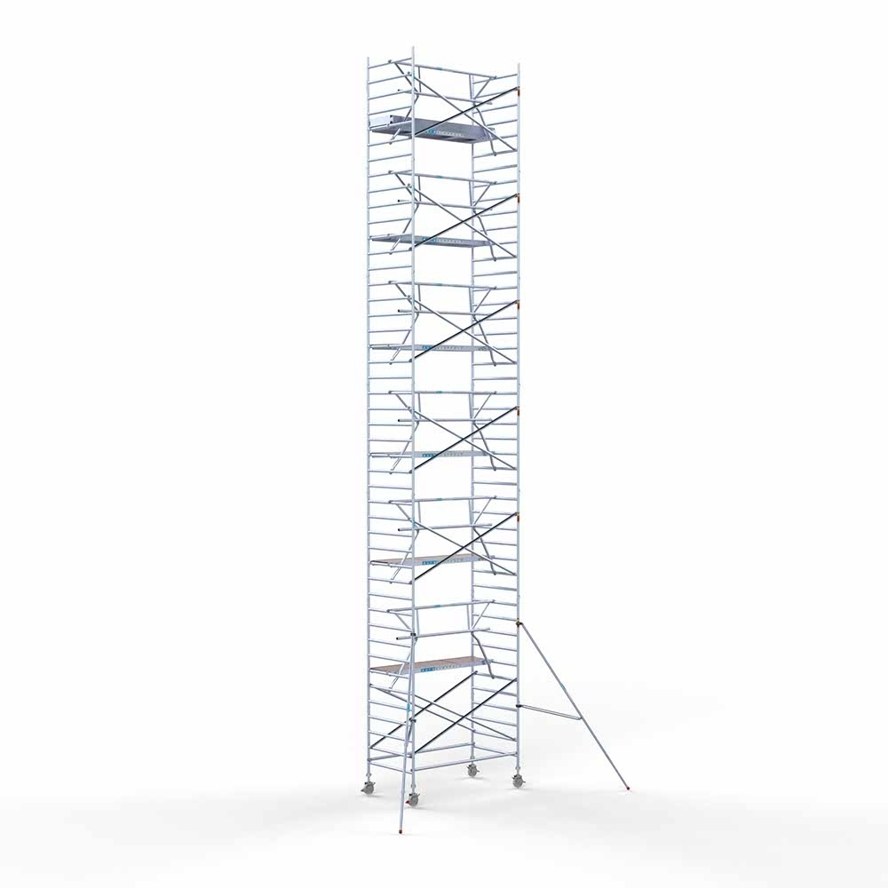 Deze rolsteiger heeft een steigerbreedte van 135, wat voor stabiliteit en stevigheid zorgt. De platformlengte is 250, wat voldoende werkruimte biedt. De werkhoogte van de rolsteiger is 14,2, waardoor je veilig op de gewenste hoogte kunt werken.