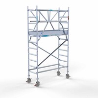 Deze rolsteiger heeft een steigerbreedte van 75, wat voor stabiliteit en stevigheid zorgt. De platformlengte is 190, wat voldoende werkruimte biedt. De werkhoogte van de rolsteiger is 4,2, waardoor je veilig op de gewenste hoogte kunt werken.