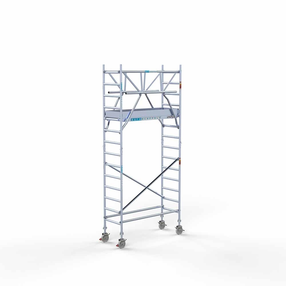 Let wel; Door de vernieuwde EN 1004 norm en het A-blad rolsteigers voldoen de Euroscaffold compleet met enkel schoren zonder voorloopleuning niet meer aan de regelgeving voor zakelijk gebruik. De Compleet uitvoering met voorloopleuningen voldoen hier wel aan. Voor particulier gebruik is de uitvoering met schoren wel voldoende.