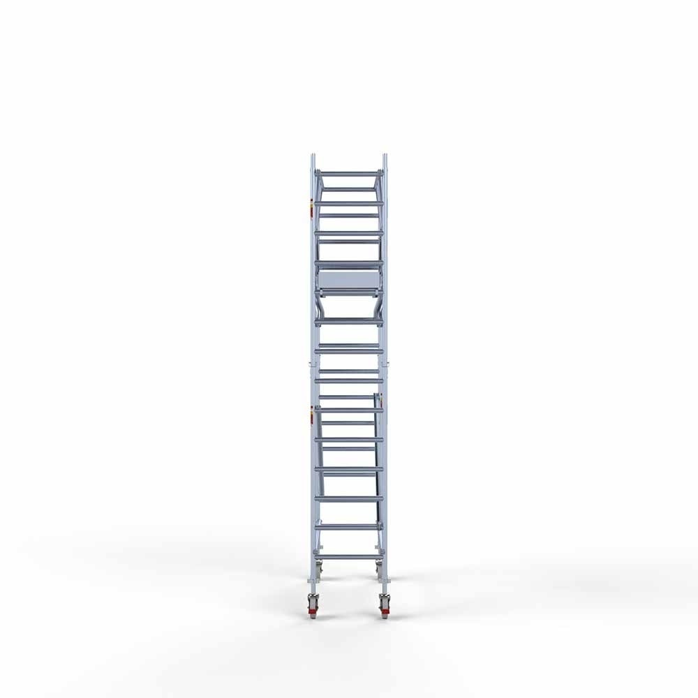 Deze rolsteiger heeft een steigerbreedte van 75, wat voor stabiliteit en stevigheid zorgt. De platformlengte is 190, wat voldoende werkruimte biedt. De werkhoogte van de rolsteiger is 5,2, waardoor je veilig op de gewenste hoogte kunt werken.
