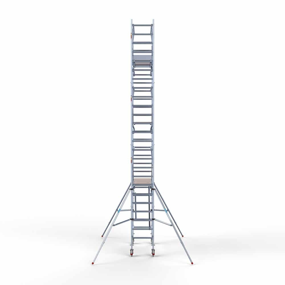 Deze rolsteiger heeft een steigerbreedte van 75, wat voor stabiliteit en stevigheid zorgt. De platformlengte is 190, wat voldoende werkruimte biedt. De werkhoogte van de rolsteiger is 8,2, waardoor je veilig op de gewenste hoogte kunt werken.