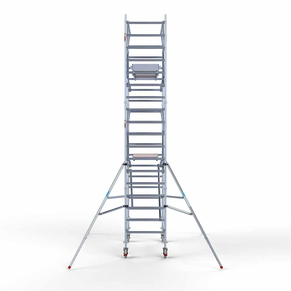 Deze rolsteiger heeft een steigerbreedte van 90, wat voor stabiliteit en stevigheid zorgt. De platformlengte is 190, wat voldoende werkruimte biedt. De werkhoogte van de rolsteiger is 6,2, waardoor je veilig op de gewenste hoogte kunt werken.