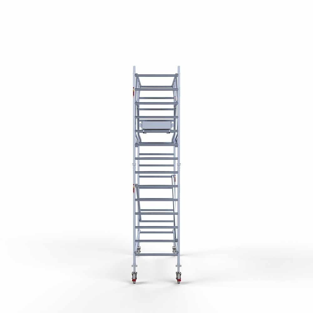 Deze rolsteiger heeft een steigerbreedte van 90, wat voor stabiliteit en stevigheid zorgt. De platformlengte is 305, wat voldoende werkruimte biedt. De werkhoogte van de rolsteiger is 5,2, waardoor je veilig op de gewenste hoogte kunt werken.