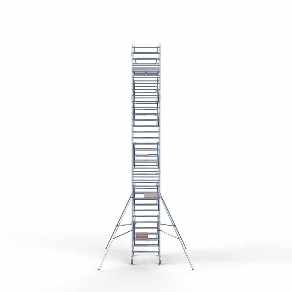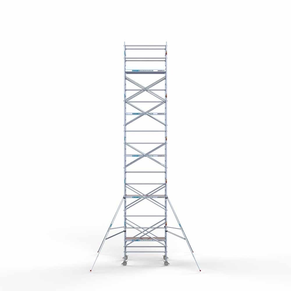 Deze rolsteiger heeft een steigerbreedte van 135, wat voor stabiliteit en stevigheid zorgt. De platformlengte is 190, wat voldoende werkruimte biedt. De werkhoogte van de rolsteiger is 11,2, waardoor je veilig op de gewenste hoogte kunt werken.