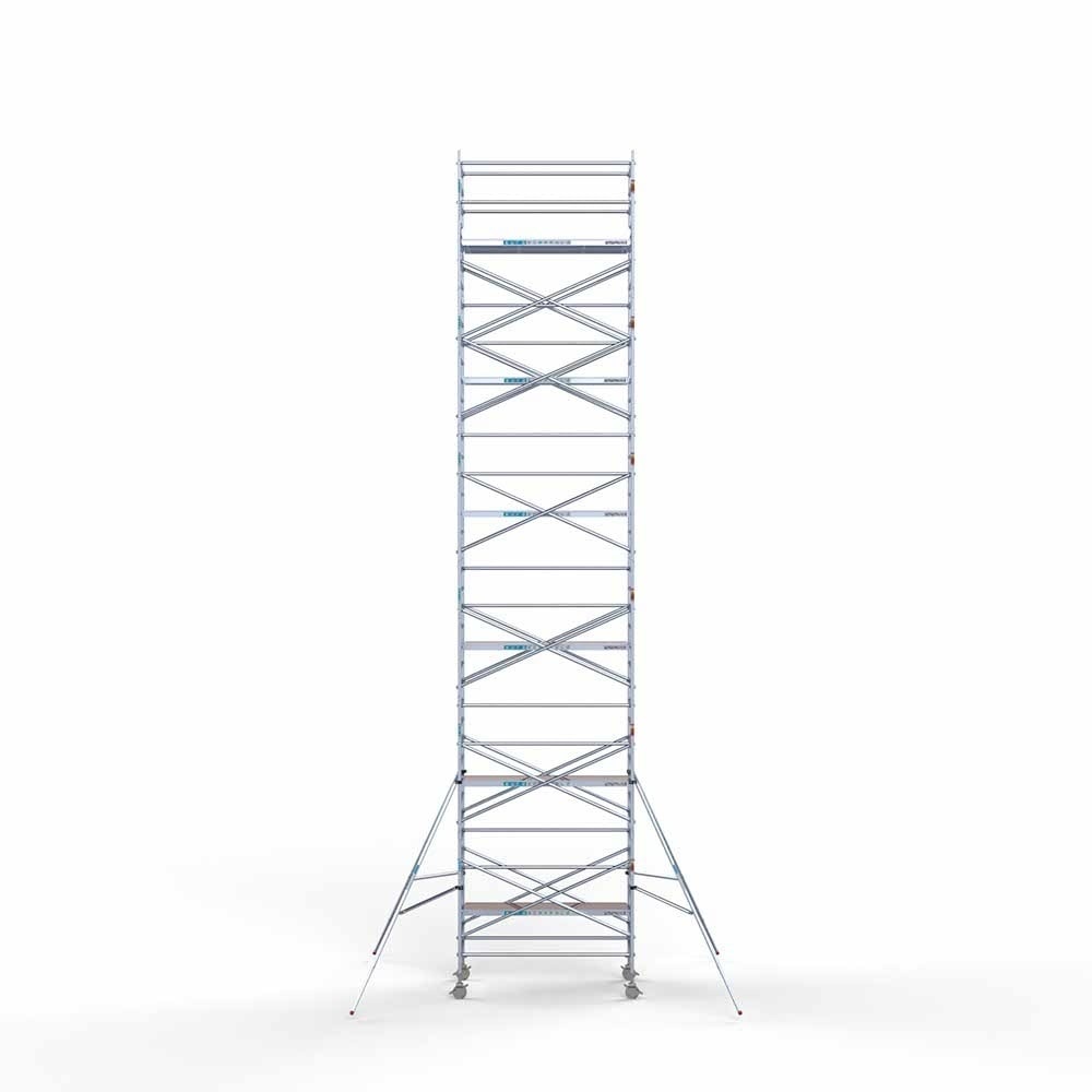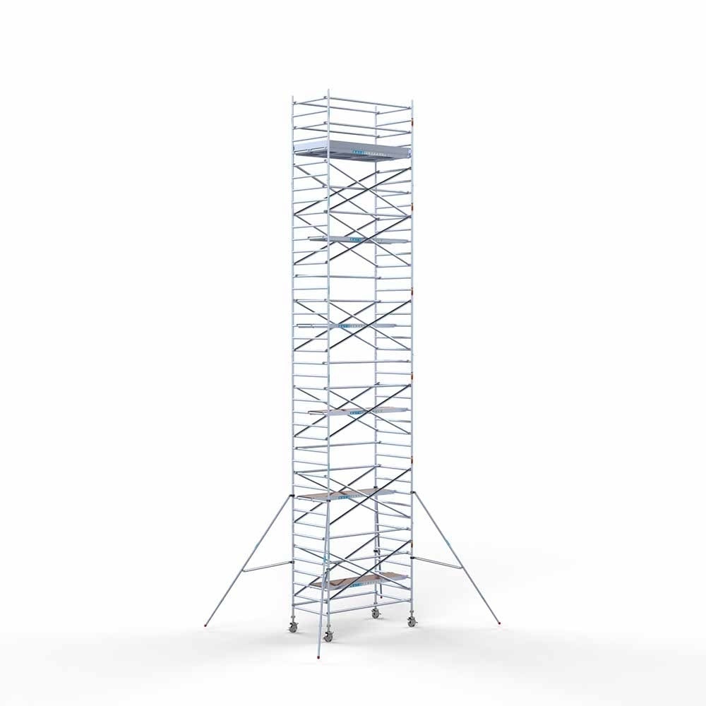 Deze rolsteiger heeft een steigerbreedte van 135, wat voor stabiliteit en stevigheid zorgt. De platformlengte is 250, wat voldoende werkruimte biedt. De werkhoogte van de rolsteiger is 13,2, waardoor je veilig op de gewenste hoogte kunt werken.