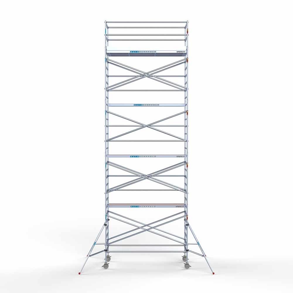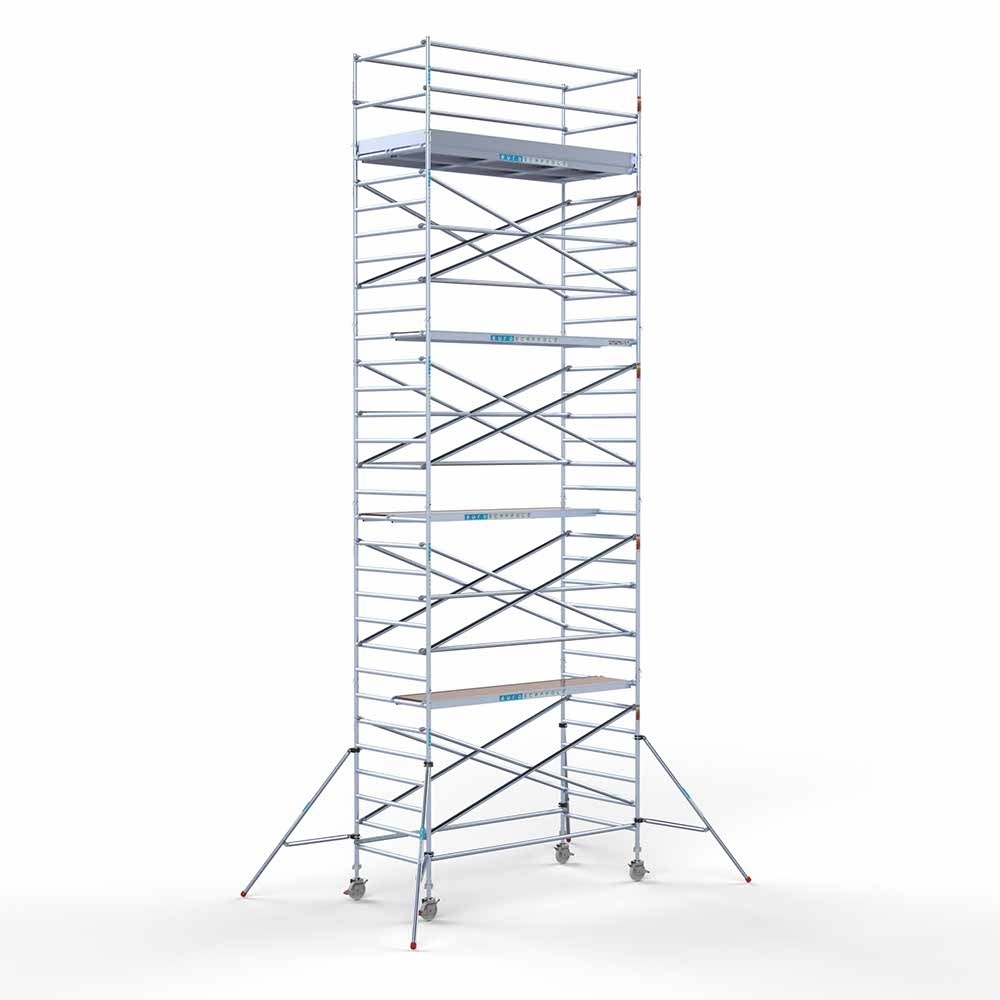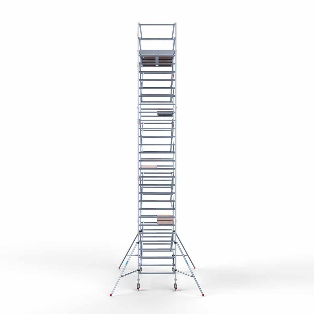 Deze rolsteiger heeft een steigerbreedte van 135, wat voor stabiliteit en stevigheid zorgt. De platformlengte is 305, wat voldoende werkruimte biedt. De werkhoogte van de rolsteiger is 10,2, waardoor je veilig op de gewenste hoogte kunt werken.