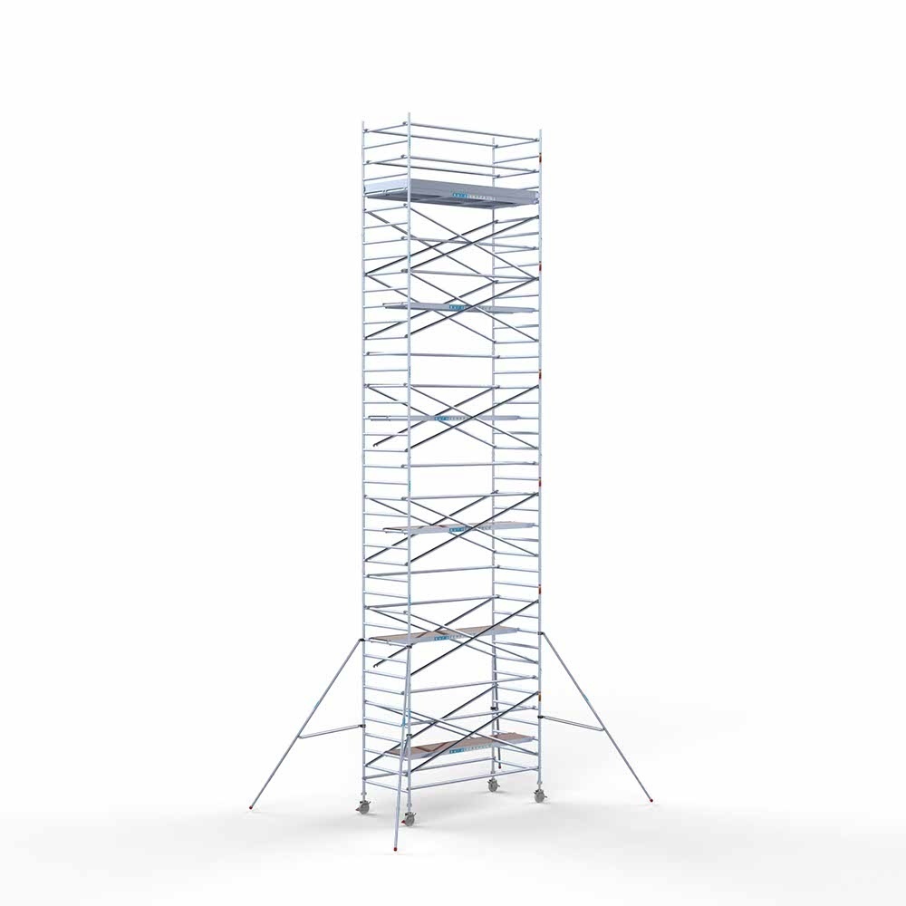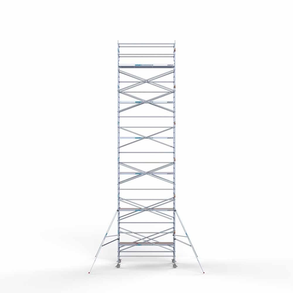 Deze rolsteiger heeft een steigerbreedte van 135, wat voor stabiliteit en stevigheid zorgt. De platformlengte is 305, wat voldoende werkruimte biedt. De werkhoogte van de rolsteiger is 13,2, waardoor je veilig op de gewenste hoogte kunt werken.
