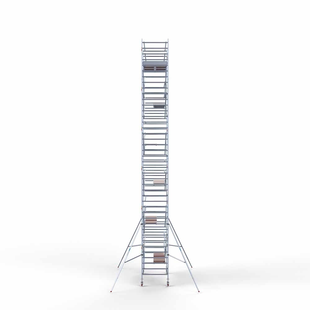 Let wel; Door de vernieuwde EN 1004 norm en het A-blad rolsteigers voldoen de Euroscaffold compleet met enkel schoren zonder voorloopleuning niet meer aan de regelgeving voor zakelijk gebruik. De Compleet uitvoering met voorloopleuningen voldoen hier wel aan. Voor particulier gebruik is de uitvoering met schoren wel voldoende.