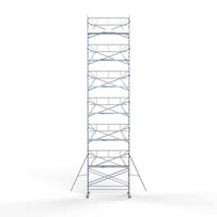 Deze rolsteiger heeft een steigerbreedte van 135, wat voor stabiliteit en stevigheid zorgt. De platformlengte is 305, wat voldoende werkruimte biedt. De werkhoogte van de rolsteiger is 14,2, waardoor je veilig op de gewenste hoogte kunt werken.