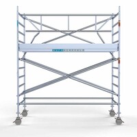 Deze rolsteiger heeft een steigerbreedte van 135, wat voor stabiliteit en stevigheid zorgt. De platformlengte is 305, wat voldoende werkruimte biedt. De werkhoogte van de rolsteiger is 4,2, waardoor je veilig op de gewenste hoogte kunt werken.