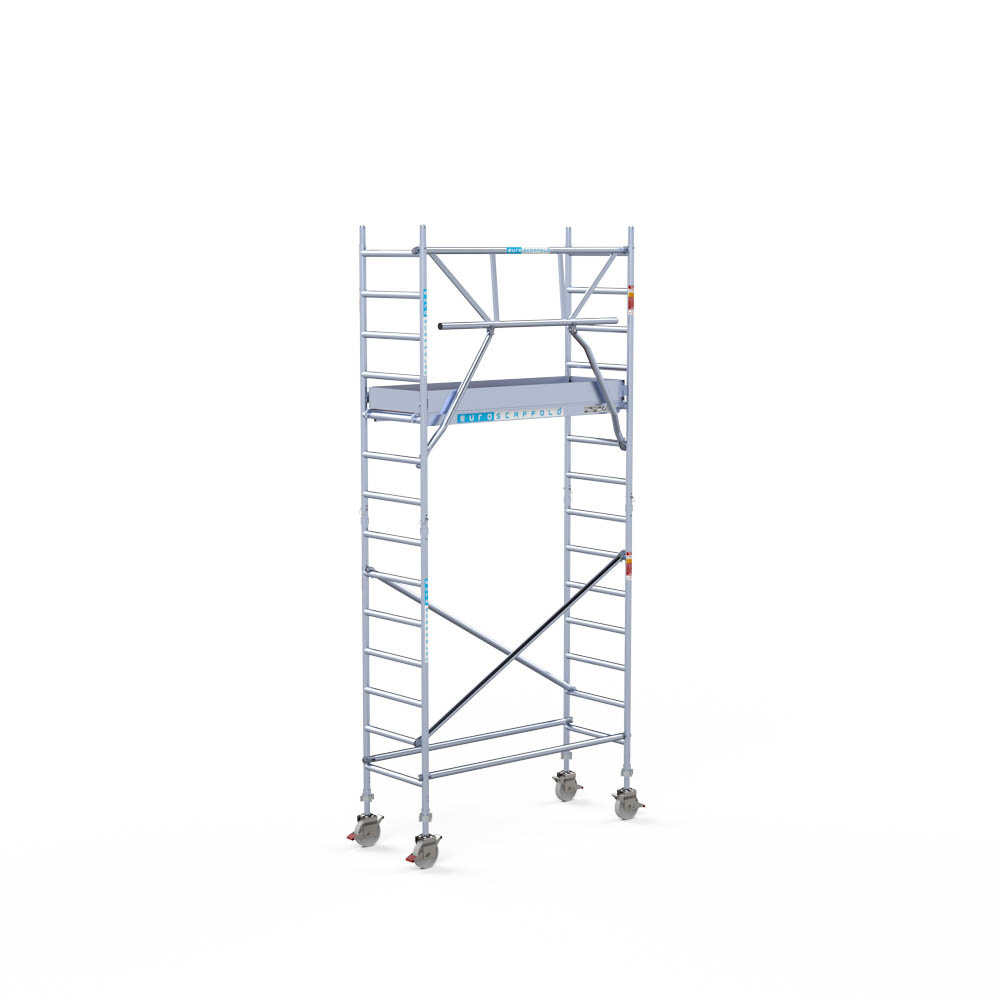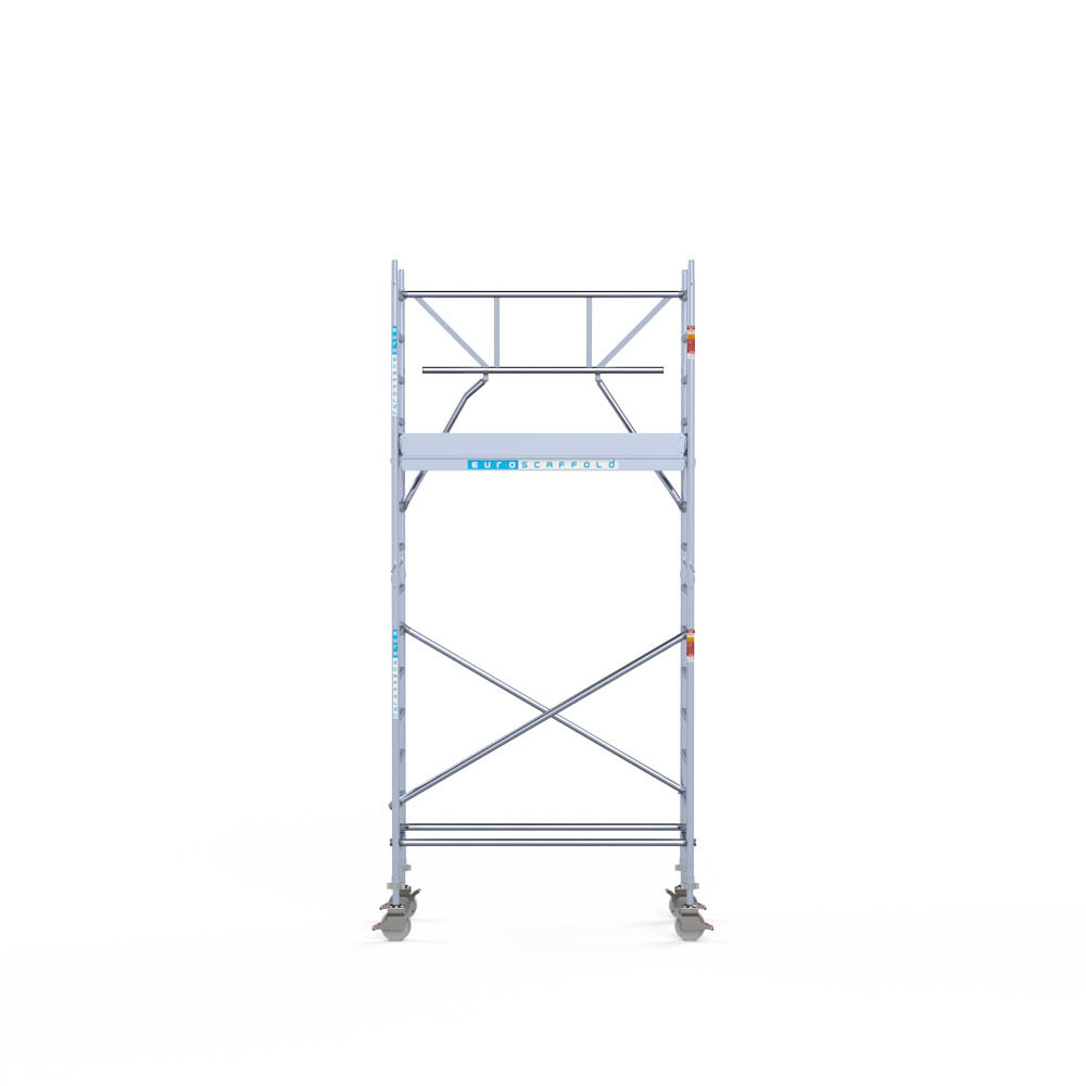 Let wel; Door de vernieuwde EN 1004 norm en het A-blad rolsteigers voldoen de Euroscaffold compleet met enkel schoren zonder voorloopleuning niet meer aan de regelgeving voor zakelijk gebruik. De Compleet uitvoering met voorloopleuningen voldoen hier wel aan. Voor particulier gebruik is de uitvoering met schoren wel voldoende.
