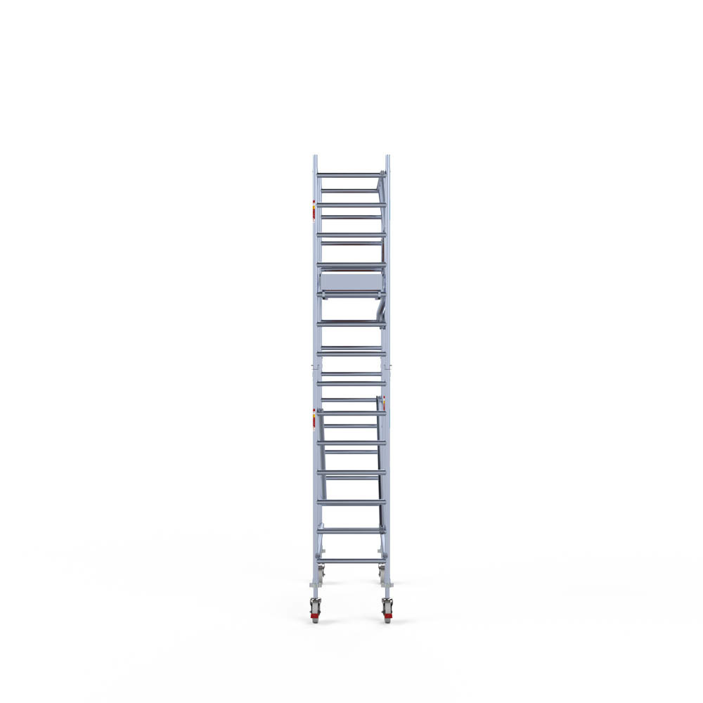 Deze rolsteiger heeft een steigerbreedte van 75, wat voor stabiliteit en stevigheid zorgt. De platformlengte is 190, wat voldoende werkruimte biedt. De werkhoogte van de rolsteiger is 5,2, waardoor je veilig op de gewenste hoogte kunt werken.