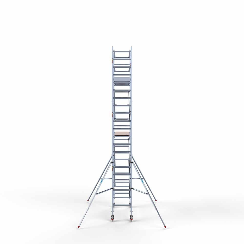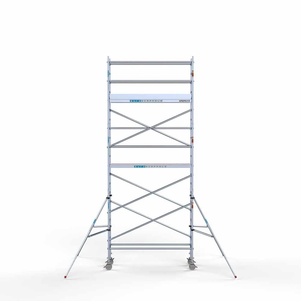 Deze rolsteiger heeft een steigerbreedte van 75, wat voor stabiliteit en stevigheid zorgt. De platformlengte is 250, wat voldoende werkruimte biedt. De werkhoogte van de rolsteiger is 7,2, waardoor je veilig op de gewenste hoogte kunt werken.