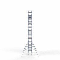 Deze rolsteiger heeft een steigerbreedte van 75, wat voor stabiliteit en stevigheid zorgt. De platformlengte is 250, wat voldoende werkruimte biedt. De werkhoogte van de rolsteiger is 9,2, waardoor je veilig op de gewenste hoogte kunt werken.
