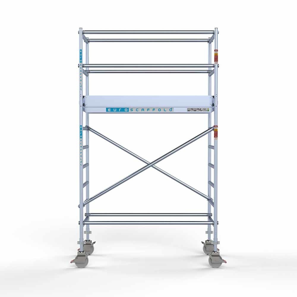 Let wel; Door de vernieuwde EN 1004 norm en het A-blad rolsteigers voldoen de Euroscaffold compleet met enkel schoren zonder voorloopleuning niet meer aan de regelgeving voor zakelijk gebruik. De Compleet uitvoering met voorloopleuningen voldoen hier wel aan. Voor particulier gebruik is de uitvoering met schoren wel voldoende.
