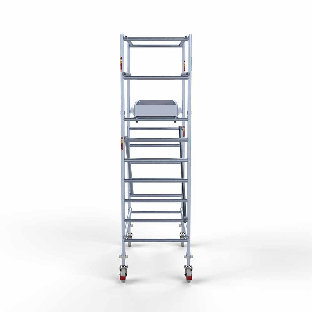 Deze rolsteiger heeft een steigerbreedte van 90, wat voor stabiliteit en stevigheid zorgt. De platformlengte is 190, wat voldoende werkruimte biedt. De werkhoogte van de rolsteiger is 4,2, waardoor je veilig op de gewenste hoogte kunt werken.