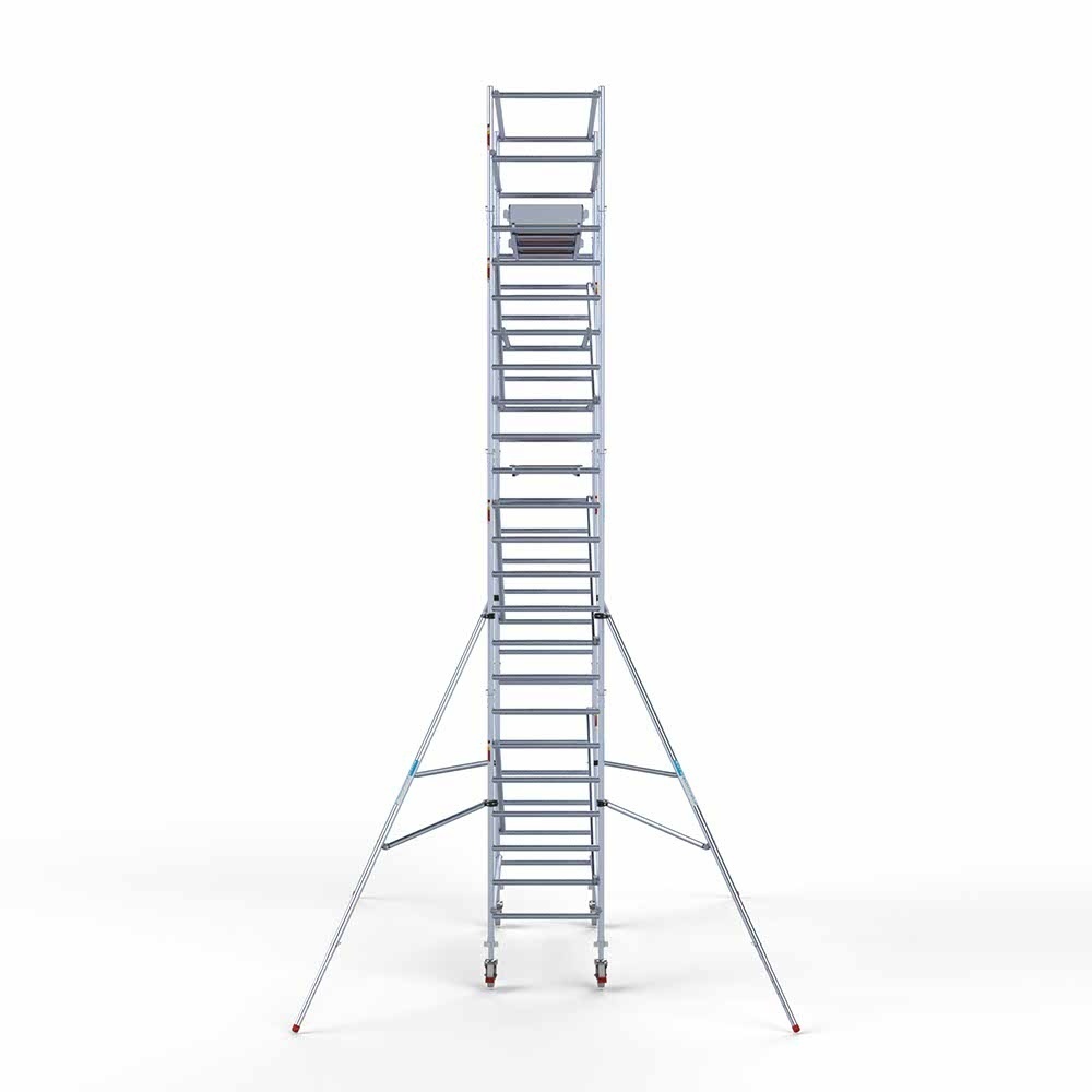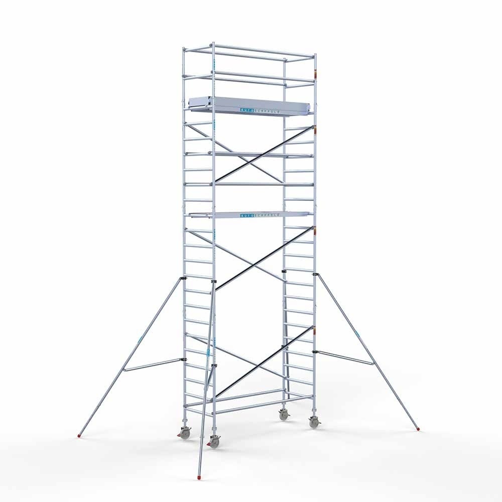 Deze rolsteiger heeft een steigerbreedte van 90, wat voor stabiliteit en stevigheid zorgt. De platformlengte is 250, wat voldoende werkruimte biedt. De werkhoogte van de rolsteiger is 8,2, waardoor je veilig op de gewenste hoogte kunt werken.