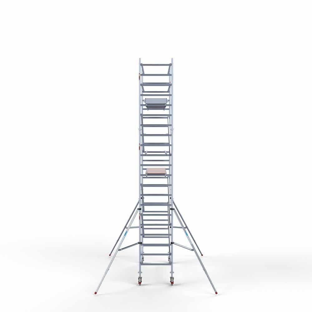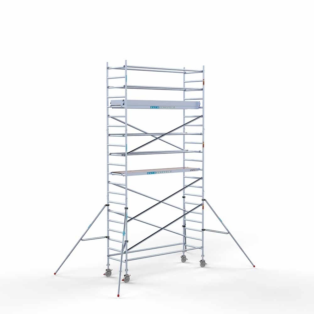 Deze rolsteiger heeft een steigerbreedte van 90, wat voor stabiliteit en stevigheid zorgt. De platformlengte is 305, wat voldoende werkruimte biedt. De werkhoogte van de rolsteiger is 7,2, waardoor je veilig op de gewenste hoogte kunt werken.