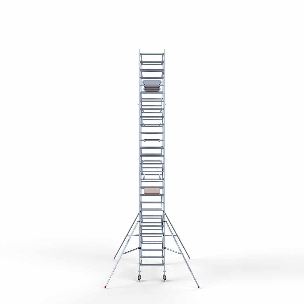 Deze rolsteiger heeft een steigerbreedte van 90, wat voor stabiliteit en stevigheid zorgt. De platformlengte is 305, wat voldoende werkruimte biedt. De werkhoogte van de rolsteiger is 9,2, waardoor je veilig op de gewenste hoogte kunt werken.